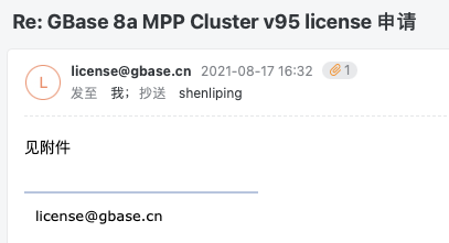 - 邮件标题:GBase 8a MPP Cluster v95 license 申请