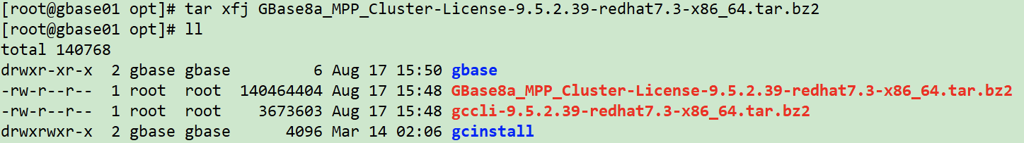 tar xfj GBase8a_MPP_Cluster-License-9.5.2.39-redhat7.3-x86_64.tar.bz2