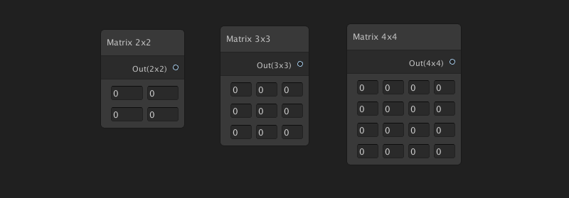 矩阵节点:定义一个2x2,3x3,4x4 的矩阵。通常用来计算平移,旋转,缩放。