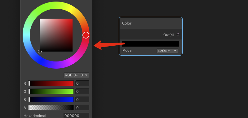 颜色节点:定义一个指定颜色的思维变量,点击颜色区域会弹出颜色编辑面板,分为Default和HDP两种模式。
