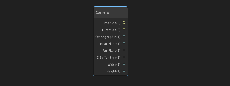 相机节点:提供对当前渲染的相机各种参数访问,这由Camera的 GameObject的值组成,包括:位置,方向,正交(是正交返回1,否则返回0),近/远平面,Z轴缓冲区标志(使用反向Z缓冲返回-1,否则返回1),宽/高度(正交模式下才有)。