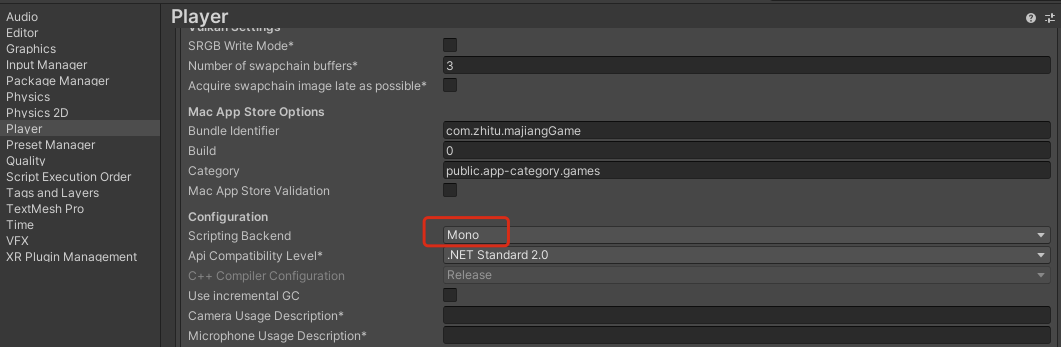 在PlayerSettings面板 --> Player --> OtherSettings 下 Scripting Backend设置为Mono: