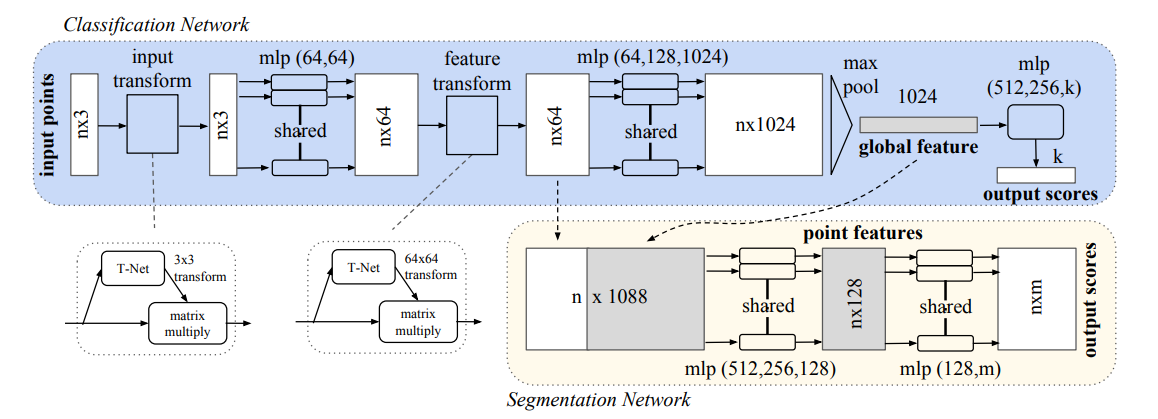 PointNet是直接对点云进行处理的,它对输入点云中的每一个点,学习其对应的空间编码,之后再利用所有点的特征得到一个全局的点云特征。