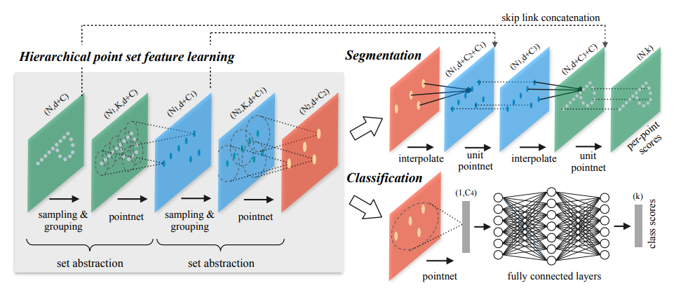 对于分类问题,直接用PointNet提取全局特征,采用全连接得到每个类别评分。对于分割问题,将高维的点反距离插值得到与低维相同的点数,再特征融合,再使用PointNet提取特征 。