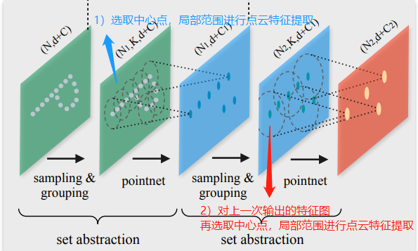 先在输入点集中选择一些点作为中心点,然后围绕每个中心点选择周围的点组成一个区域,之后每个区域作为PointNet的一个输入样本,得到一组特征,这个特征就是这个区域的特征。