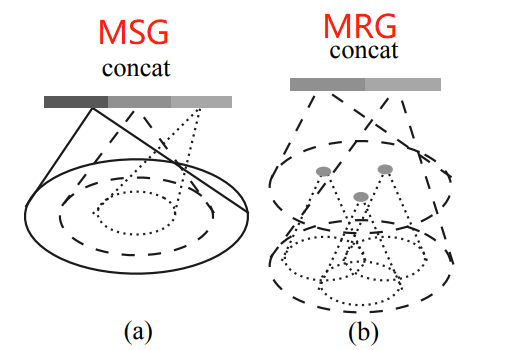 不同于图片数据分布在规则的像素网格上且有均匀的数据密度,点云数据在空间中的分布是不规则且不均匀的。当点云不均匀时,每个子区域中如果在分区的时候使用相同的球半径,会导致部分稀疏区域采样点过小。作者提出多尺度成组 (MSG)和多分辨率成组 (MRG)两种解决办法