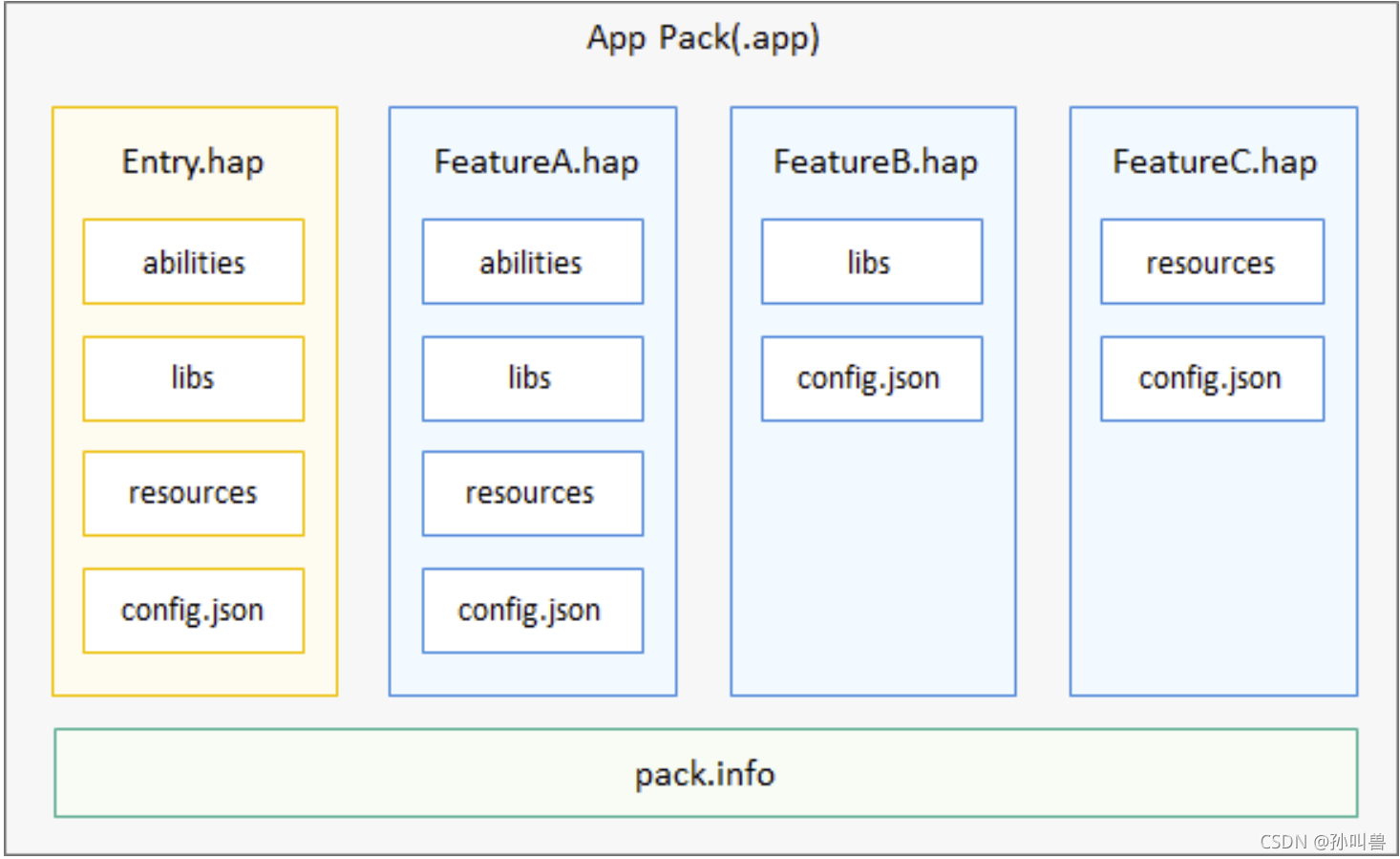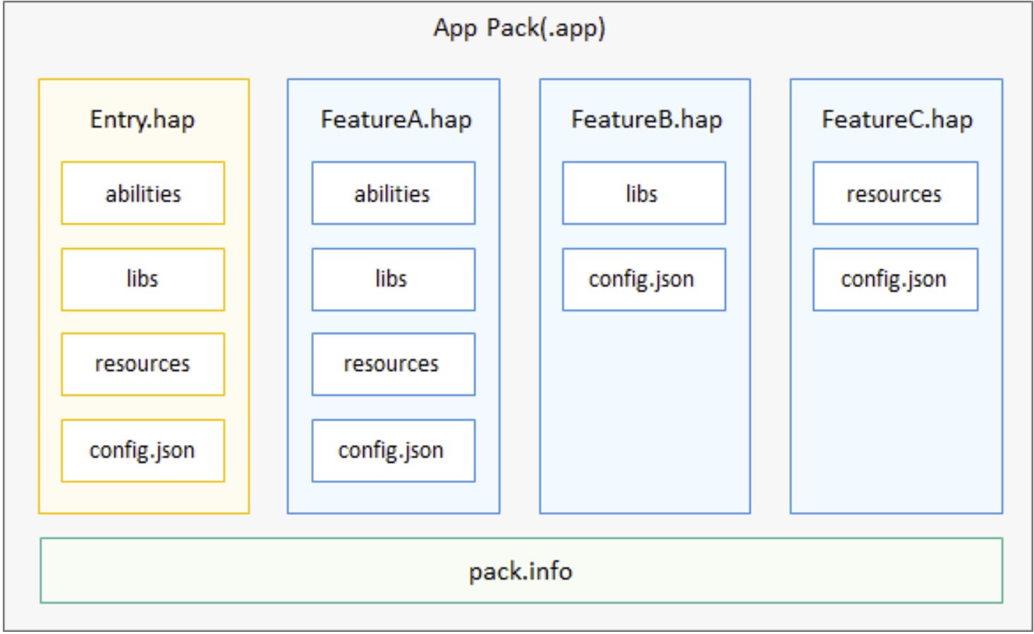 HarmonyOS 的应用软件包以 APP Pack(Application Package)形式发布,它是由一个 或多个 HAP(HarmonyOS Ability Package)以及描述每个 HAP 属性的 pack.info 组成。 HAP 是 Ability 的部署包,HarmonyOS 应用代码围绕 Ability 组件展开。 一个 HAP 是由代码、资源、第三方库及应用配置文件组成的模块包,可分为 entry 和 feature 两种模块类型。