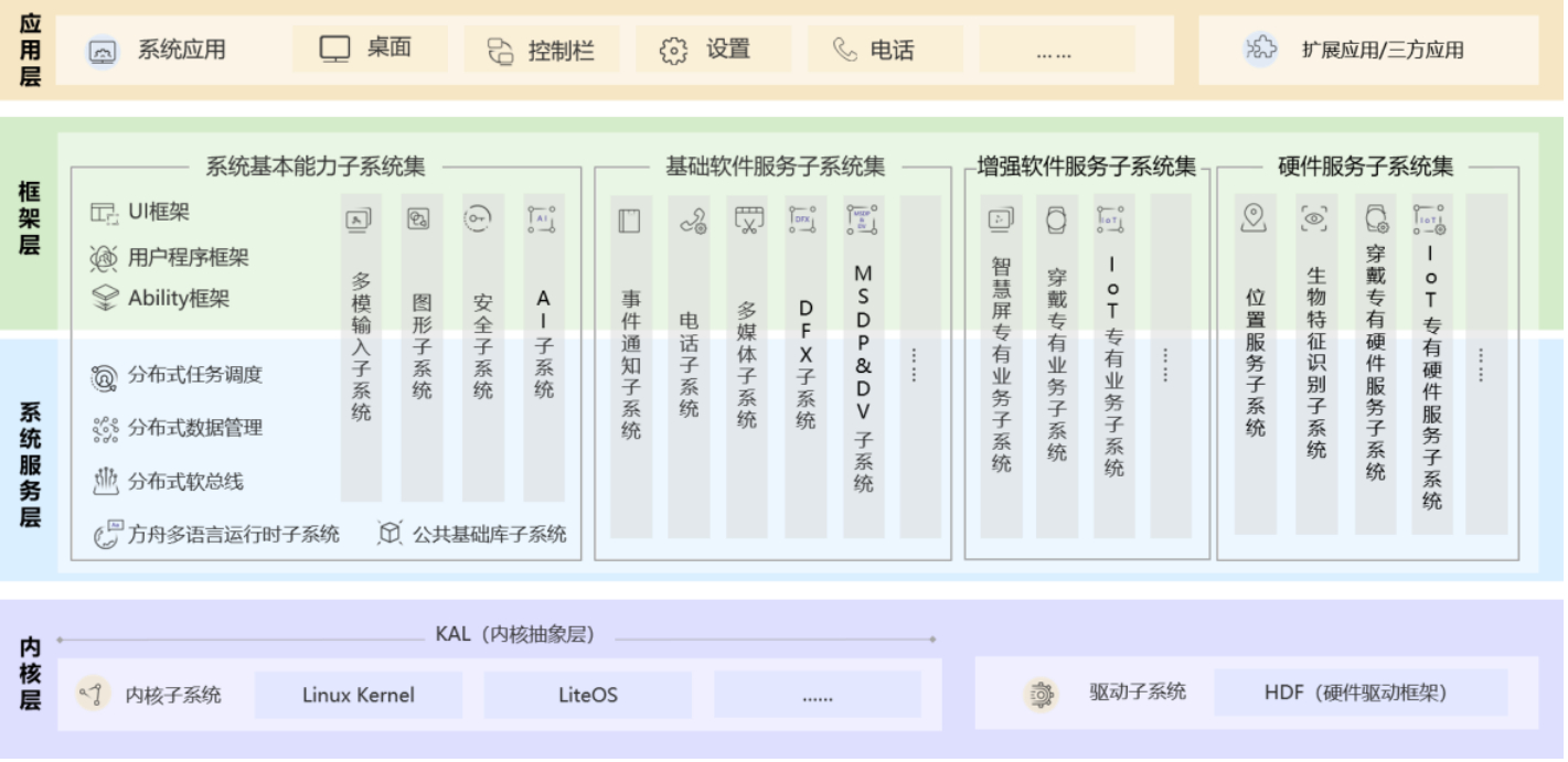 增强软件服务子系统集:为 HarmonyOS 提供针对不同设备的、差异化的能力增强型 软件服务,由智慧屏专有业务、穿戴专有业务、IoT 专有业务等子系统组成。
