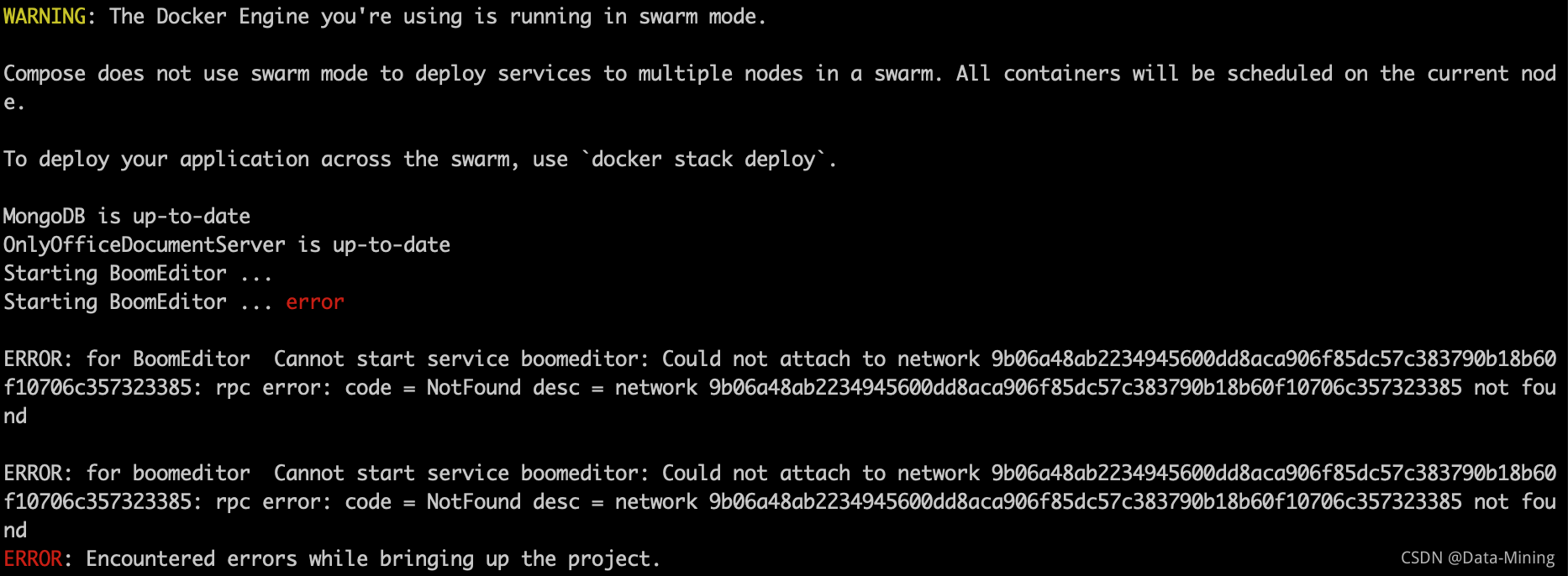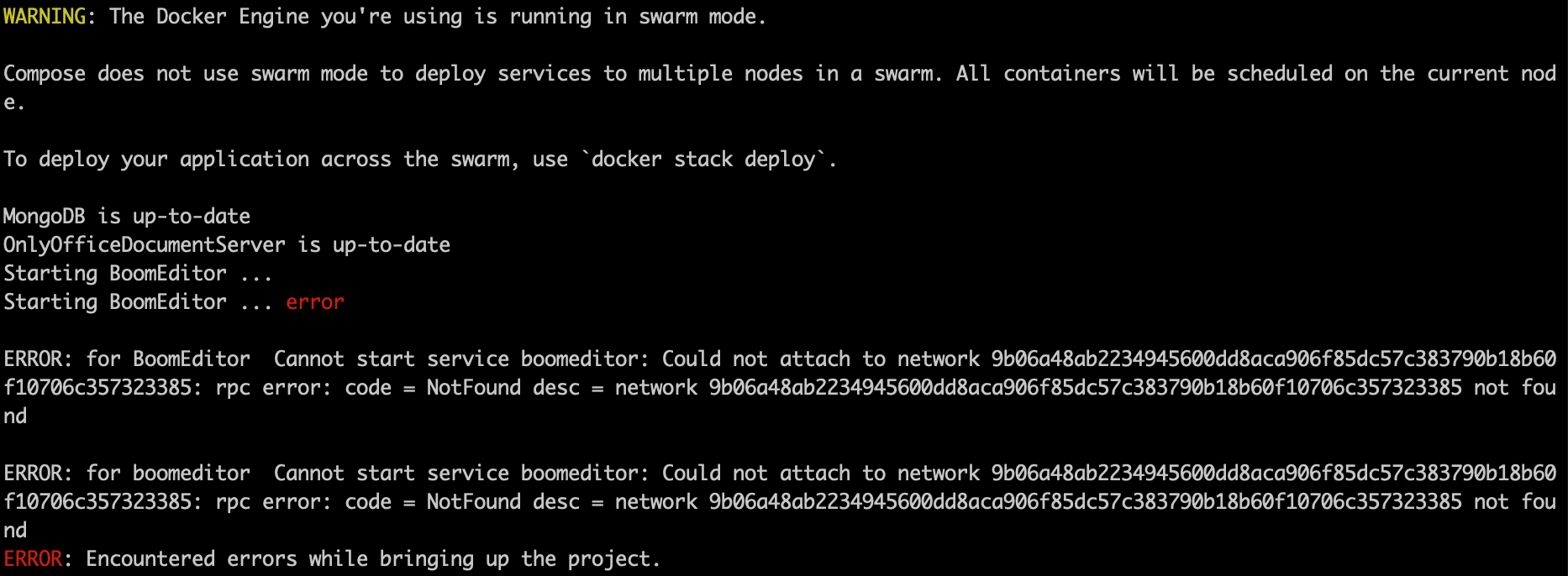 ERROR: for boomeditor Cannot start service boomeditor: Could not attach to network 9b06a48ab2234945600dd8aca906f85dc57c383790b18b60f10706c357323385: rpc error: code = NotFound desc = network 9b06a48ab2234945600dd8aca906f85dc57c383790b18b60f10706c357323385 not found