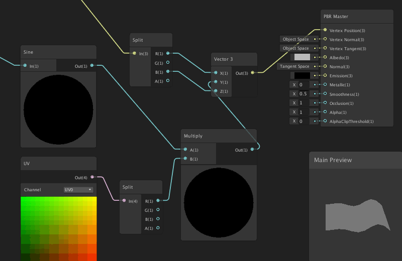 创建UV节点,创建Split拆分节点对UV进行拆分,然后将拆分后的值,和4步骤中的Sine节点使用Multiply乘法节点连接起来,再赋值给2步骤中预览的Y轴输入: