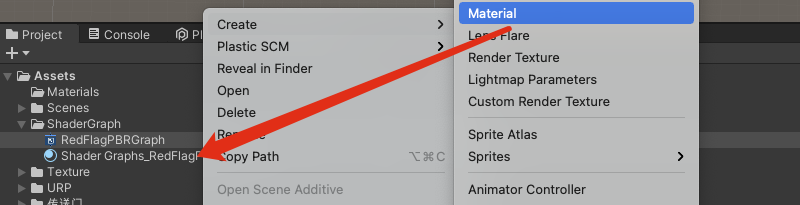 这里提供一个快捷创建材质球的方法,鼠标选中我们保存的“RedFlagPBRGraph”文件,然后右键创建材质球,这样我们创建出来的材质球,就自动使用这个Shader了。
