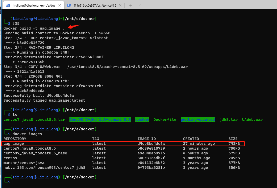 这里的话,我们用之前的一個镜像為基础镜像。发布一个web应用。如果有使用docker客户端工具,那么每次可以远程直接替换,war实现部署, UAWeb.war 是我们自己的应用war包。