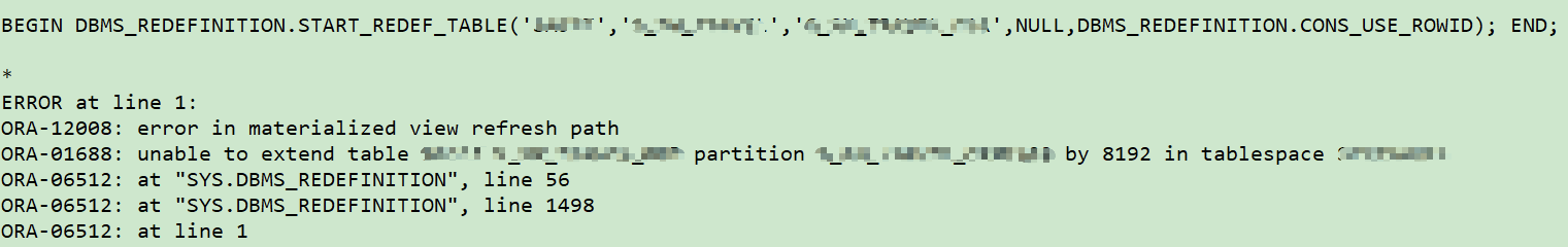 今天执行转分区表操作时,使用在线重定义,去吃个饭的功夫,表空间满了,报错如下: