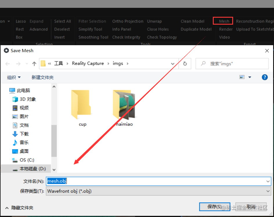 点击RECONSTRUCTION, 在工具栏的右侧有一个Mesh。 可以将建立的3D模型导出