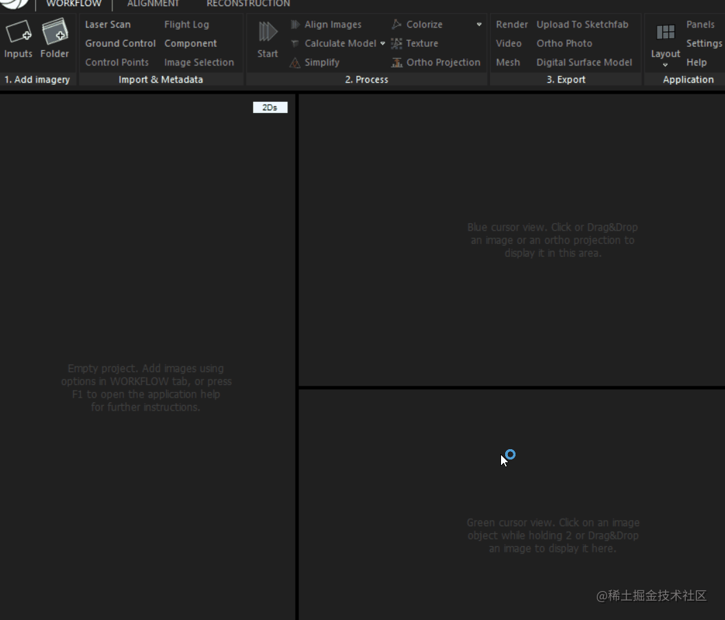 打开Reality Capture,在界面的左上角,有两个图标按钮,Inputs和Folder