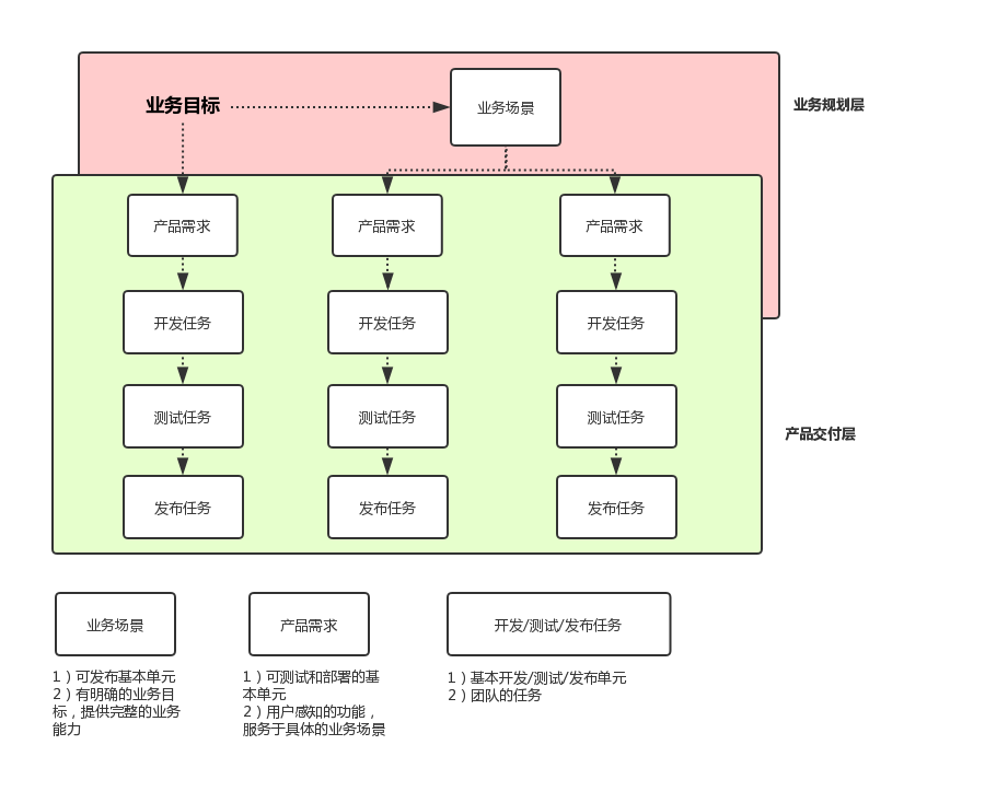 - 产品交付层:开发任务向产品需求对齐,快速高质量的交付有用的需求,持续提升交付效率
