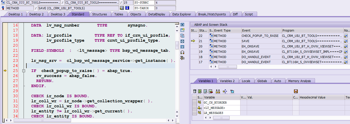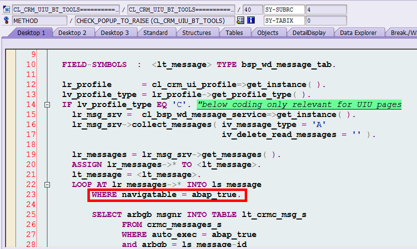 上图代码的逻辑翻译成文字就是:当且仅当一个message的navigation 属性被设置成abap_true且在system table CRMC_MESSAGES_S里存在对应的entry且其AUTO_EXEC 字段设置为abap_true时,才会弹出popup window并且阻止save: