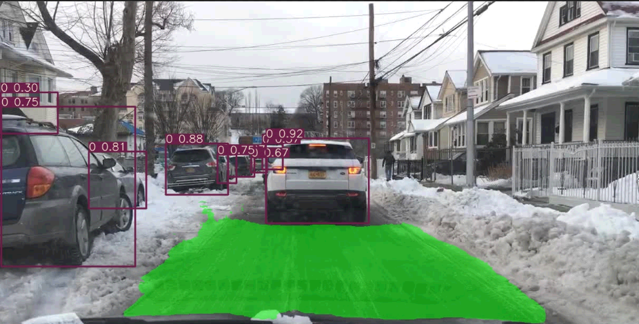 在上图中,紫色边界框表示交通对象,绿色区域是可行驶区域,红色线表示车道线。