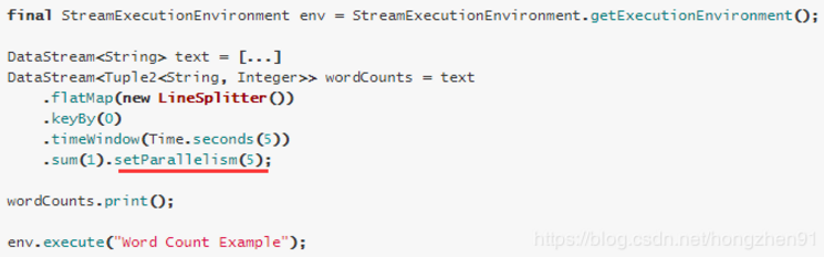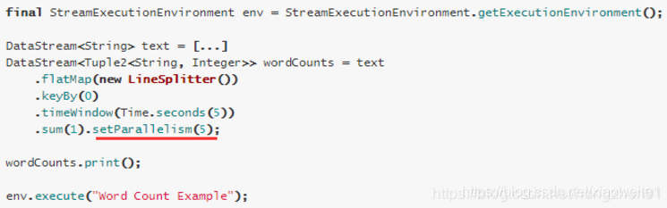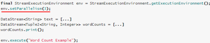 执行环境(任务)的默认并行度可以通过调用setParallelism()方法指定。为了以并行度3来执行所有的算子、数据源和data sink, 可以通过如下的方式设置执行环境的并行度: