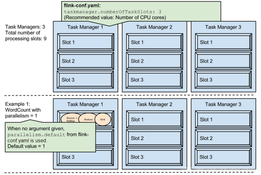 在fink-conf.yaml中 taskmanager.numberOfTaskSlots 默认值为1,即每个Task Manager上只有一个Slot ,此处是3