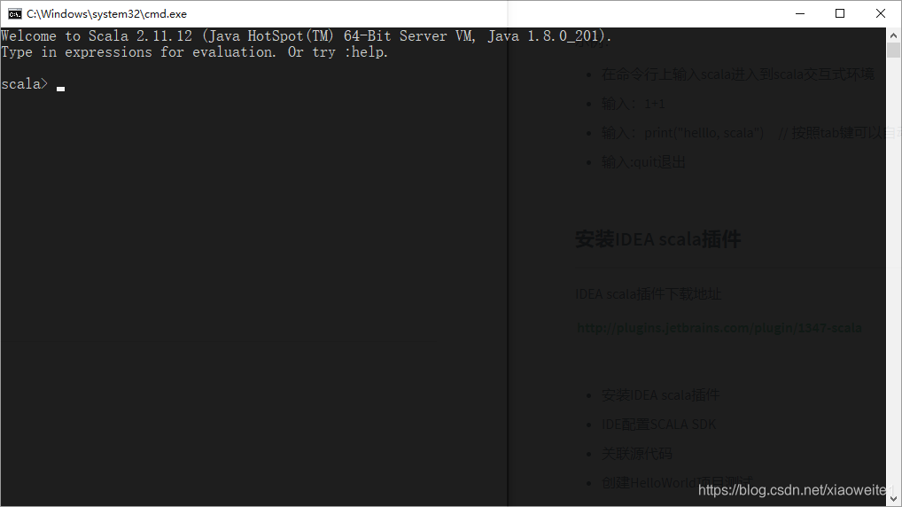 在scala命令提示窗口中执行:quit,即可退出解释器