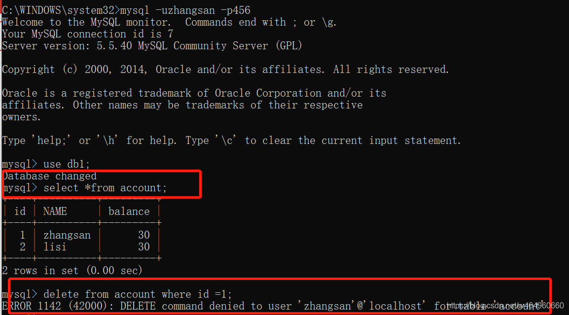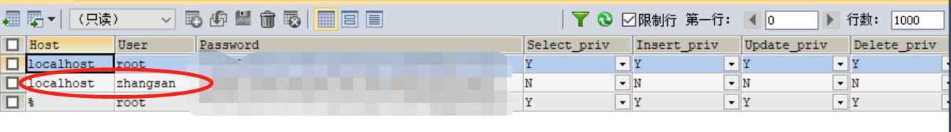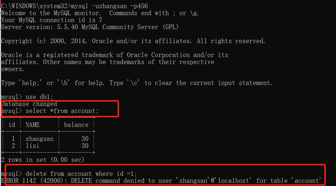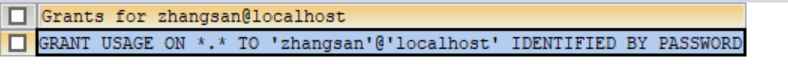 【举例】:给用户zhangsan授予查询权限:GRANT SELECT ON db1.account TO 'zhangsan'@'localhost';