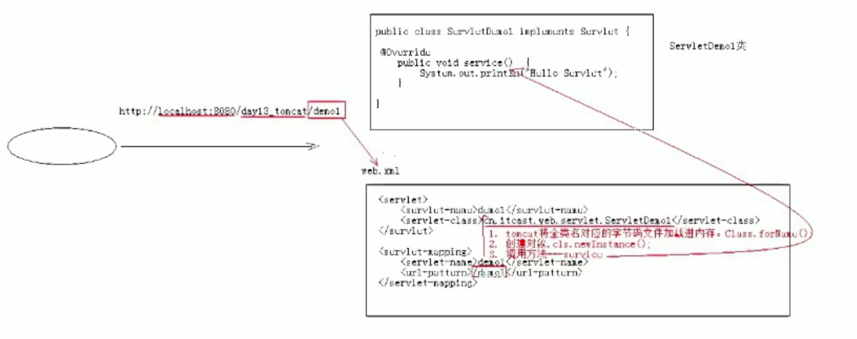 - 4)tomcat会将字节码文件加载进内存,并且创建其对象;