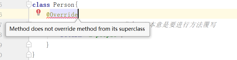 以上程序,本意是想Person类中覆写Object类的toString()方法,但是由于自己的失误,字母写错了,而程序编译又不会报错,以为是一个新的方法,所以,若想在程序编译时报错,可以使用注解@Override。