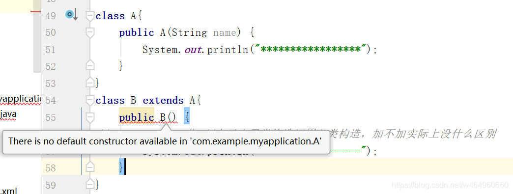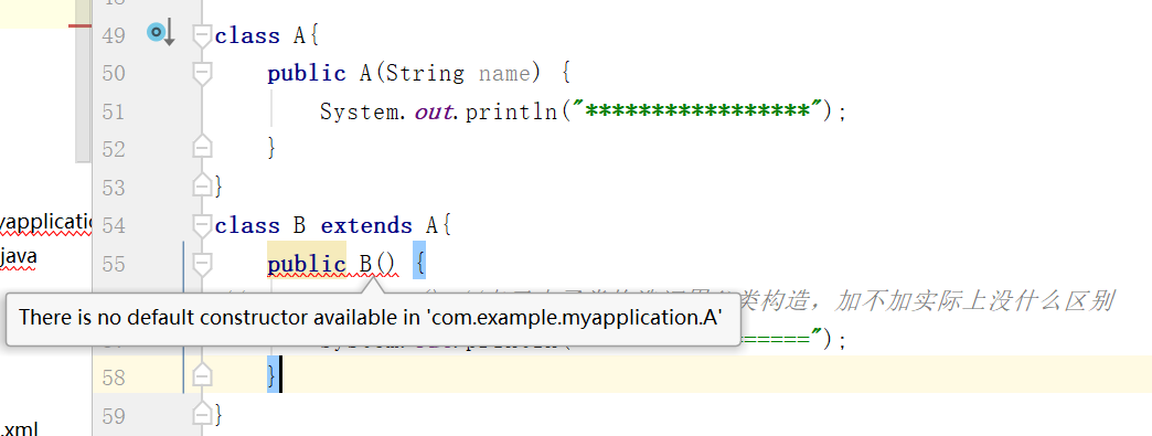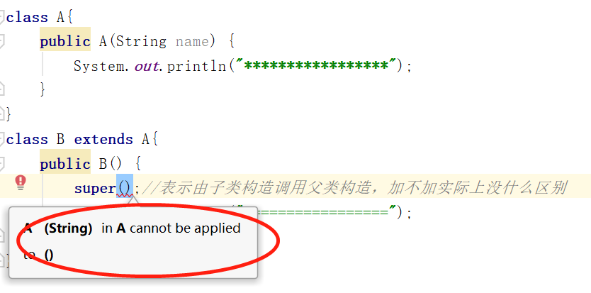 以上,类A中没有无参构造方法,B中注释掉super还是会报错,此时使用隐藏的super并不合适,所以应该明确调用使用指定参数的构造方法,以下代码再次编译OK。
