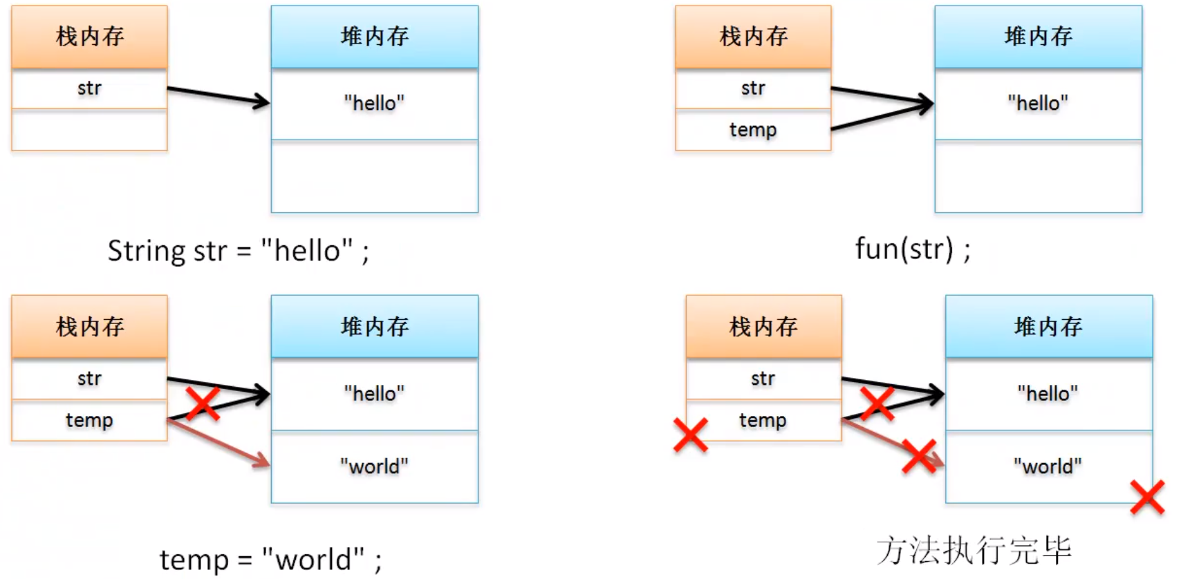 以上输出的是hello,注意字符串一旦声明则不可改变,字符串内容的改变依靠的是引用的改变实现,观察如下内存分析图: