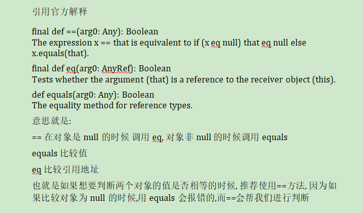 - 与Java不一样,在scala中,可以直接使用==、!=进行比较,它们与equals方法表示一致。而比较两个对象的引用值,使用eq