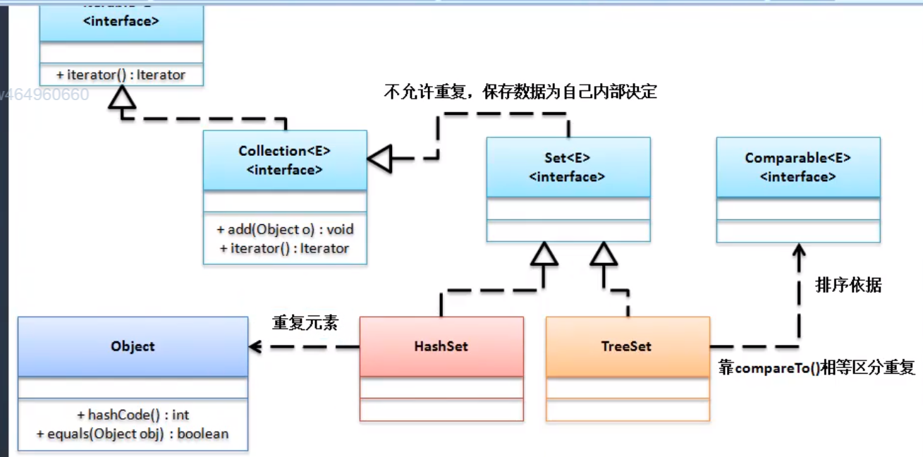 Comparable只是适合于TreeXX类型的集合消除重复元素,而真正意义的重复判断不是利用Comparable接口完成,而是利用Object类的两个方法完成: