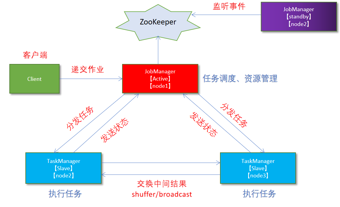 在 Zookeeper 的帮助下,一个 Standalone的Flink集群会同时有多个活着的 JobManager,其中只有一个处于工作状态,其他处于 Standby 状态。当工作中的 JobManager 失去连接后(如宕机或 Crash),Zookeeper 会从 Standby 中选一个新的 JobManager 来接管 Flink 集群。