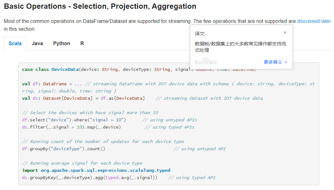 ds.filter(_.signal > 10).map(_.device) // using typed APIs