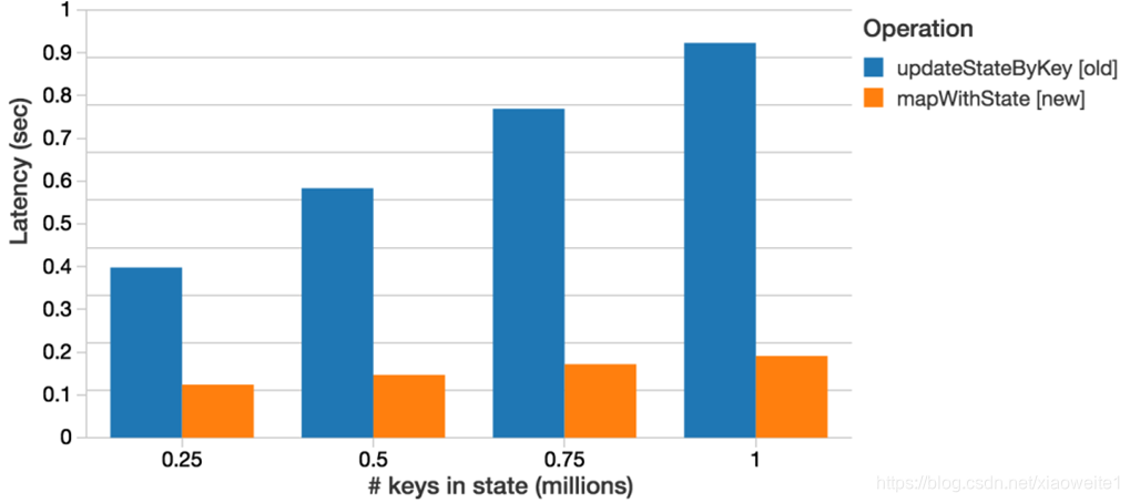 这样做的好处是,我们可以只是关心那些已经发生的变化的key,对于没有数据输入,则不会返回那些没有变化的key的数据。这样的话,即使数据量很大,checkpoint也不会像updateStateByKey那样,占用太多的存储。