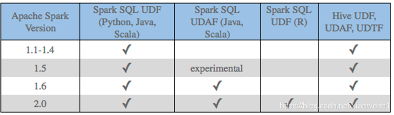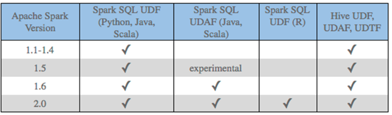 目前来说Spark 框架各个版本及各种语言对自定义函数的支持: