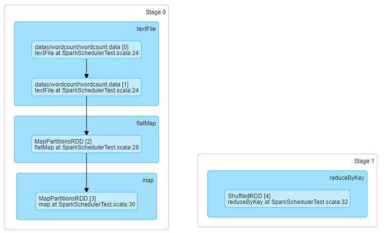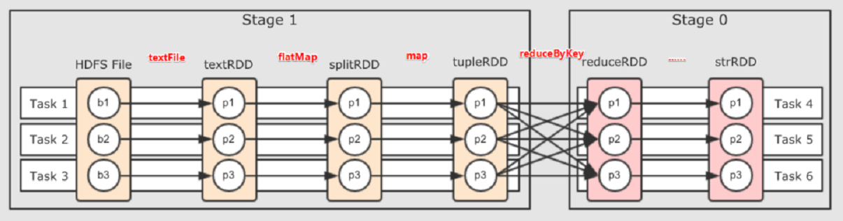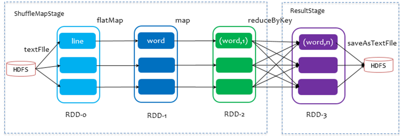 以词频统计WordCount程序为例,Job执行是DAG图: