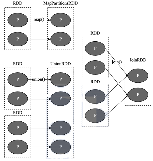 上图中 P代表 RDD中的每个分区(Partition),我们看到,RDD 中每个分区内的数据在上面的几种转移操作之后被一个分区所使用,即其依赖的父分区只有一个。比如图中的 map、union 和 join 操作,都是窄依赖的。注意,join 操作比较特殊,可能同时存在宽、窄依赖。