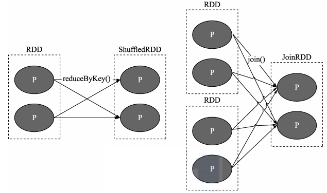 上图中 P 代表 RDD 中的多个分区,我们会发现对于 Shuffle 类操作而言,结果 RDD 中的每个分区可能会依赖多个父 RDD 中的分区。需要说明的是,依赖关系是 RDD 到 RDD 之间的一种映射关系,是两个 RDD 之间的依赖,如果在一次操作中涉及多个父 RDD,也有可能同时包含窄依赖和 Shuffle 依赖。
