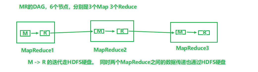 也就是M和R之间走硬盘,多个MR之间也走硬盘,同时涉及到多次的MapReduce任务的启动和释放,对效率很影响。