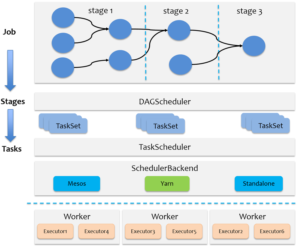 TaskScheduler负责Task级的调度,将DAGScheduler给过来的TaskSet按照指定的调度策略分发到Executor上执行,调度过程中SchedulerBackend负责提供可用资源,其中SchedulerBackend有多种实现,分别对接不同的资源管理系统。