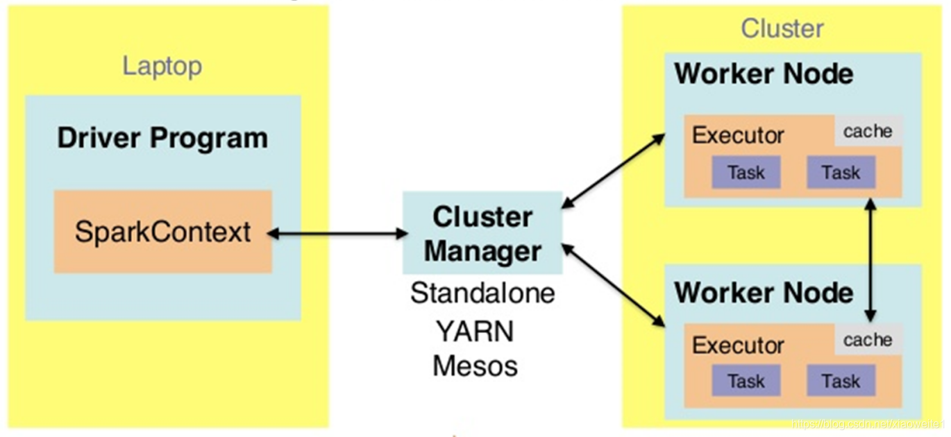 从图中可以看到Spark Application运行到集群上时,由两部分组成:Driver Program和Executors。