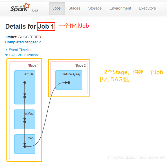 还可以发现在一个Spark Application中,包含多个Job,每个Job有多个Stage组成,每个Job执行按照DAG图进行的。