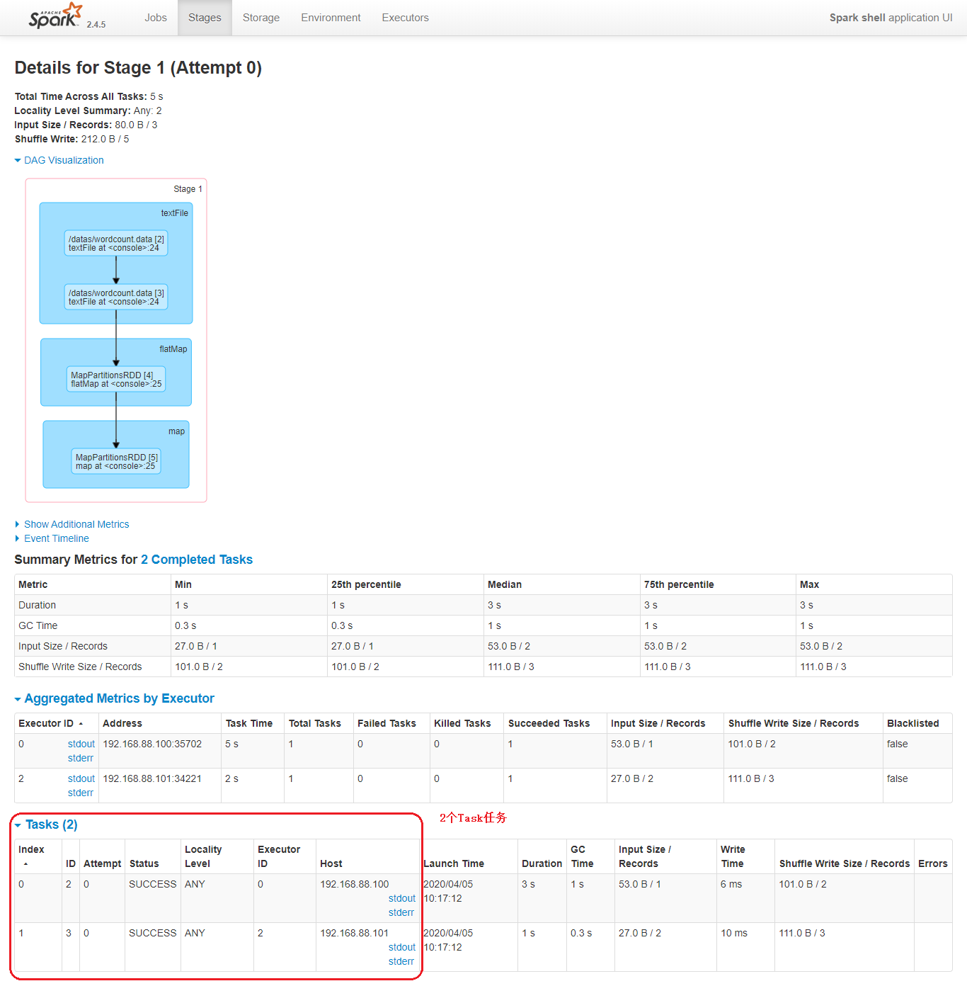 其中每个Stage中包含多个Task任务,每个Task以线程Thread方式执行,需要1Core CPU。