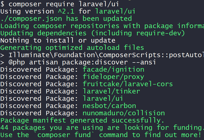 Laravel7 的 laravel/ui 包提供了一种快速方法,可以使用一些简单的命令来支持你进行身份验证所需的所有路由和视图: