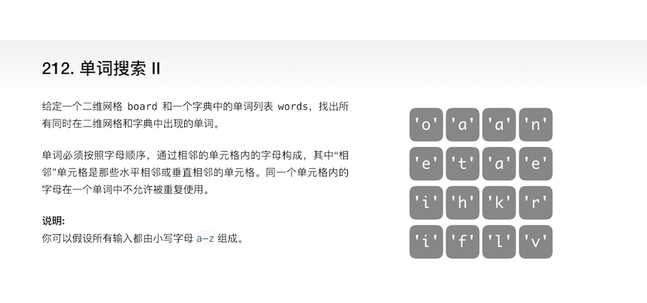 LeetCode 第 212 题:给定一个二维网格 board 和一个字典中的单词列表 words,找出所有同时在二维网格和字典中出现的单词。