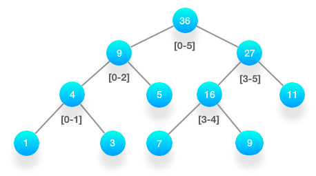 根节点保存的是从下标 0 到下标 5 的所有元素的总和,即 36。左右两个子节点分别保存左右两半元素的总和。按照这样的逻辑不断地切分下去,最终的叶子节点保存的就是每个元素的数值。