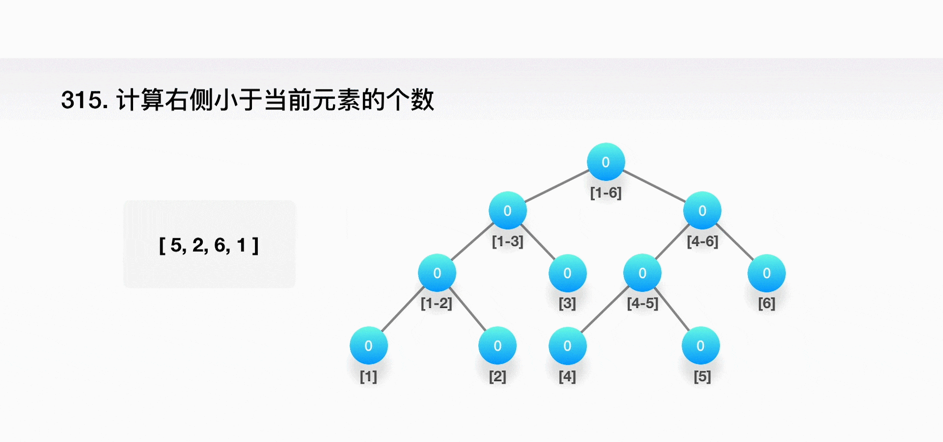 2. 初始化,每个节点记录的在此区间内的元素数量是 0,接下来从数组的最后一位开始往前遍历,每次遍历,判断这个数落在哪个区间,那么那个区间的数量加一。