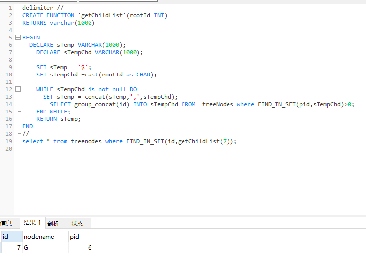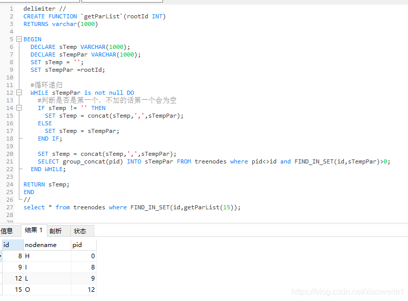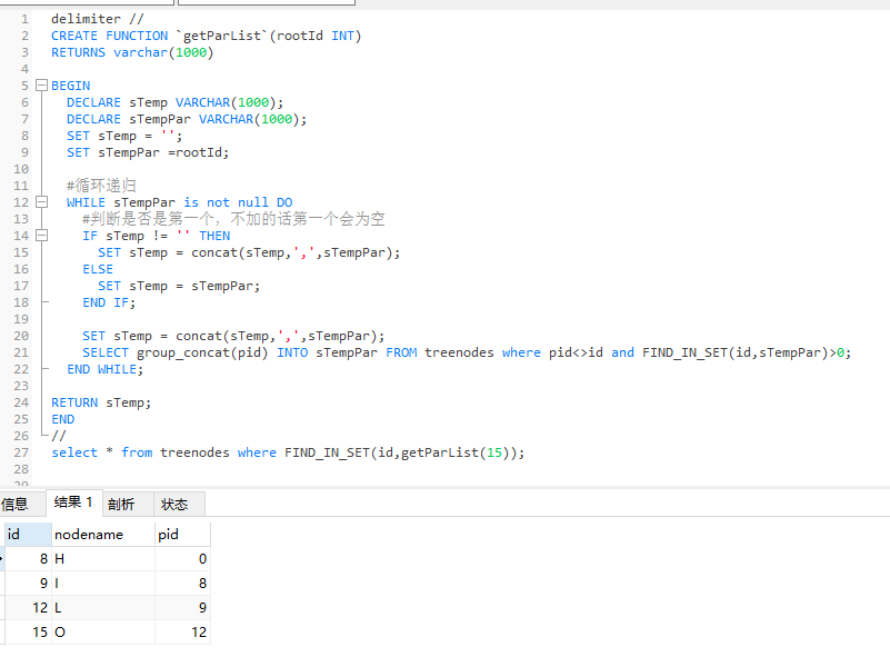 SELECT group_concat(pid) INTO sTempPar FROM treenodes where pid<>id and FIND_IN_SET(id,sTempPar)>0;