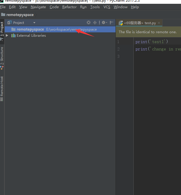 在这个过程中,也可以发现,经过这样的配置,我们的代码现在一共有三个版本:一个是本地代码,一个是服务器上的代码,还有一个是RemoteHost面板中的代码(这个地方的代码如果直接编辑了,其实也可以提交到服务器,但是不能直接运行)
